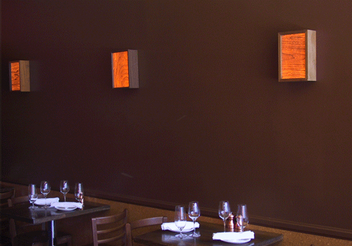 there are 8 sconces in all throughout the restaurant; made of stereo cabinets and walnut veneer, no two sconces are identical; they are