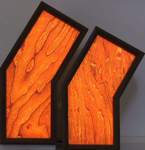the lamps were made from two old speakers cut up and reassembled to approximate the flow of the wood grain; light is activated by touching the metal stereoluz plaque on the side;